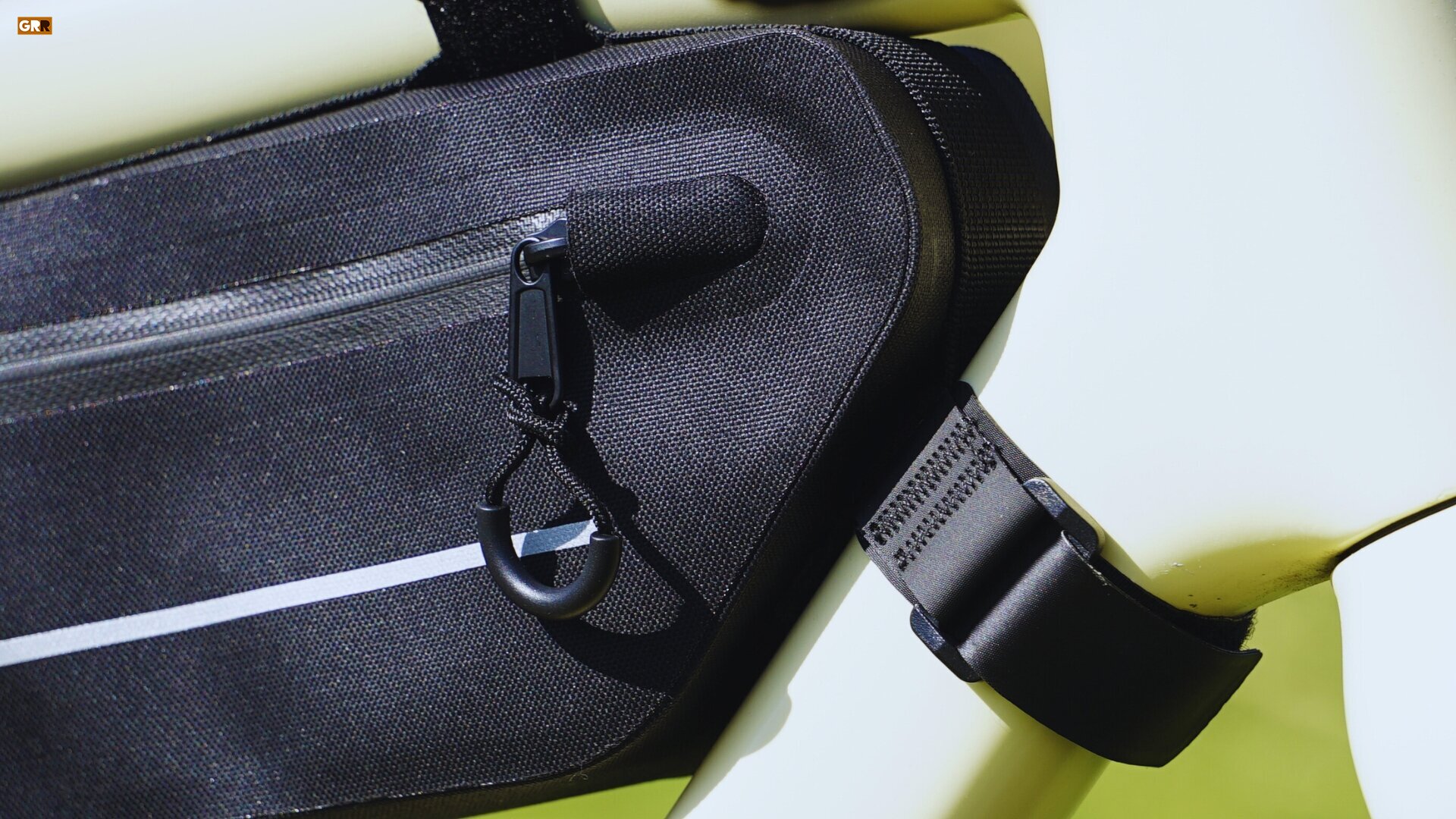 La Zéfal Adventure C3 se ancla mediante 3 correas tipo velcro, dos en la zona del tubo superior y una en la zona del tubo diagonal. Si lo quisiéramos, también podemos atarla al tubo del sillín. Personalmente, los acabados de los velcros nos han gustado bastante de primeras, parecen resistentes y se integran muy bien en la estética de la bolsa.